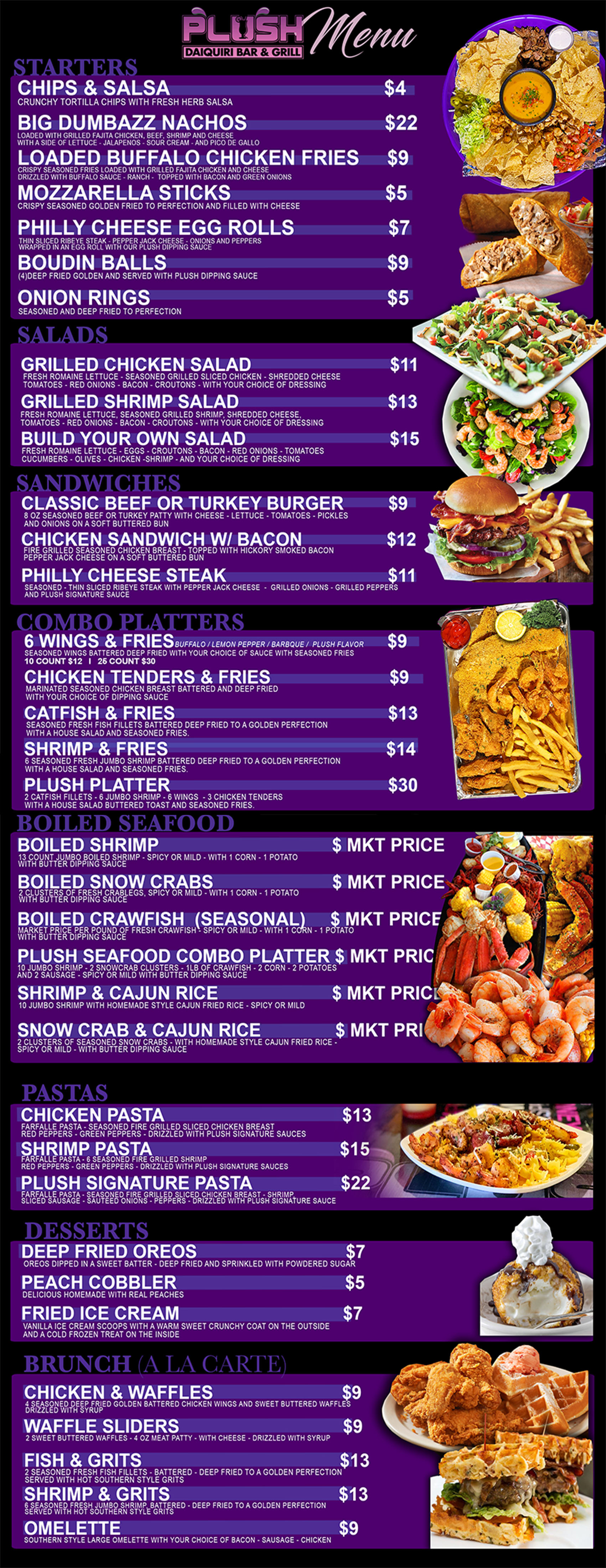 Trio of tacos with corn tortillas. Topped with crab mix breaded shrimp chunks. CLICK LINK TO PRINT MENU.